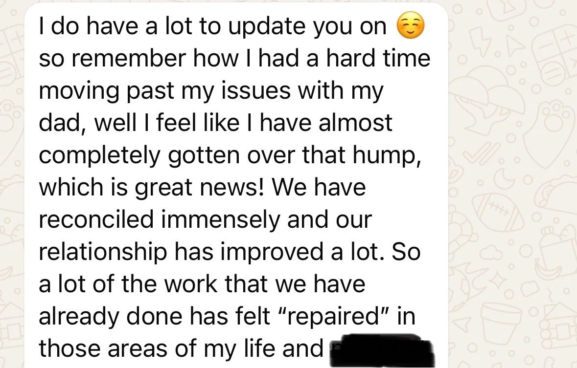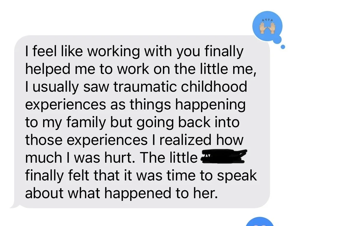 "I'm gonna try to make a long story short but I'm filled with so much gratitude. I could go on and on about what my sessions with Racquel are doing for my emotional health, my well-being, and even my physical health, but I'll spare you.😊
